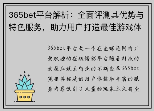 365bet平台是一个在全球范围内广受欢迎的在线博彩平台。随着科技的发展和娱乐行业的不断变革,365bet凭借其优质的用户体验和丰富的服务内容,吸引了大量的玩家。本文将全面解析365bet平台的优势与特色服务,帮助用户更好地了解其各项特点,打造最佳游戏体验。通过四个方面的详细评测,我们将深入探讨365bet的用户界面、游戏种类、支付方式以及客户服务等方面,全面呈现其如何满足全球玩家的需求和提升整体娱乐体验。