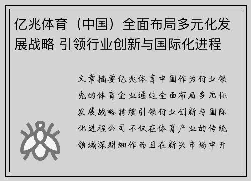 文章摘要:亿兆体育(中国)作为行业领先的体育企业,通过全面布局多元化发展战略,持续引领行业创新与国际化进程。公司不仅在体育产业的传统领域深耕细作,而且在新兴市场中开辟了多条创新路径。本文将从四个主要方面对亿兆体育(中国)的战略进行深入探讨,具体包括:一是通过多元化的产品线拓展提升市场竞争力;二是借助科技创新推动智能化体育产品的研发;三是加速国际化布局,在全球市场获得更大份额;四是致力于社会责任与可持续发展,提升企业社会价值。通过这四个维度的阐述,本文将展示亿兆体育(中国)如何通过多元化战略推动行业发展,走向更广阔的国际舞台。