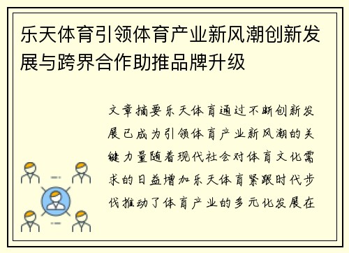 文章摘要:乐天体育通过不断创新发展,已成为引领体育产业新风潮的关键力量。随着现代社会对体育文化需求的日益增加,乐天体育紧跟时代步伐,推动了体育产业的多元化发展。在这一过程中,乐天体育不仅专注于自身品牌的提升,还通过跨界合作、整合资源以及打造创新产品等手段,实现了品牌的持续升级。通过四个方面的探讨,本文将详细分析乐天体育如何借助创新发展与跨界合作来推动体育产业的进步,以及这些措施如何为其品牌带来新的生命力与活力。本文将从乐天体育的市场定位、创新业务模式、跨界合作战略以及品牌升级四个角度出发,揭示其成功背后的核心因素。最终,本文还将结合整体分析,对乐天体育在体育产业中的角色与未来发展方向进行总结。