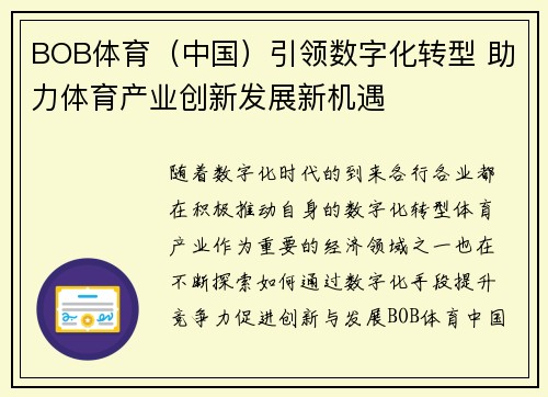 随着数字化时代的到来,各行各业都在积极推动自身的数字化转型,体育产业作为重要的经济领域之一,也在不断探索如何通过数字化手段提升竞争力,促进创新与发展。BOB体育(中国)作为体育行业的领先企业,在数字化转型过程中发挥了重要作用。本文将从四个方面详细阐述BOB体育(中国)如何引领体育产业的数字化转型,助力体育产业创新发展新机遇。具体包括:数字化技术在体育产业中的应用,数据分析驱动体育决策,创新商业模式推动体育产业发展,以及数字化转型促进体育文化建设等方面。通过这四个方面的分析,本文将全面展示BOB体育(中国)在数字化转型中的领先地位和所带来的深远影响。
