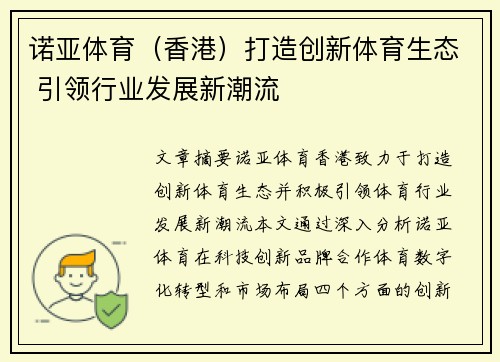诺亚体育(香港)致力于打造创新体育生态,并积极引领体育行业发展新潮流。本文通过深入分析诺亚体育在科技创新、品牌合作、体育数字化转型和市场布局四个方面的创新举措,展示了其在提升体育行业整体价值、推动产业链发展以及促进体育文化普及等方面的卓越表现。通过多维度的创新手段,诺亚体育正在打破传统体育产业格局,推动行业实现从单一体育赛事到综合体育生态的转型。本文旨在详细探讨诺亚体育如何通过其创新战略推动行业发展,为体育产业未来发展方向提供有力的参考和借鉴。诺亚体育不仅代表了传统体育领域的变革,也为其他企业提供了一个具有启发性的成功案例。最终,本文总结出,诺亚体育(香港)作为行业的领军者,正在引领整个行业朝着更加多元化、数字化和全球化的方向不断发展。