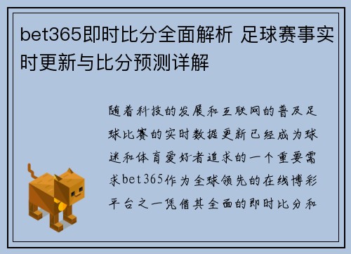 随着科技的发展和互联网的普及,足球比赛的实时数据更新已经成为球迷和体育爱好者追求的一个重要需求。bet365作为全球领先的在线博彩平台之一,凭借其全面的即时比分和比赛数据,吸引了大量的用户。本文将对bet365即时比分的功能进行详细解析,深入探讨其足球赛事实时更新与比分预测的相关内容。文章从四个方面进行阐述:一是bet365即时比分的基本功能与特点;二是bet365实时更新的技术背景与数据源;三是bet365的比分预测系统与其背后的分析模型;四是bet365即时比分对用户体验的提升及其市场影响。通过这些方面的分析,读者能够更好地理解bet365在足球赛事数据方面的优势,并掌握如何利用这些信息进行有效的赛事分析与预测。