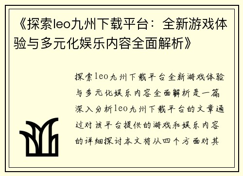 《探索leo九州下载平台:全新游戏体验与多元化娱乐内容全面解析》是一篇深入分析leo九州下载平台的文章。通过对该平台提供的游戏和娱乐内容的详细探讨,本文将从四个方面对其进行全面解析,分别为平台特色、游戏种类、娱乐内容、以及用户体验。在每个方面,我们将对其创新性、内容多样性及用户交互性等方面进行逐一阐述,探讨其如何提升用户娱乐体验并满足不同需求。通过这篇文章,读者不仅能够全面了解leo九州平台的基本构成,还能对该平台在游戏和娱乐领域的潜力做出准确评估。