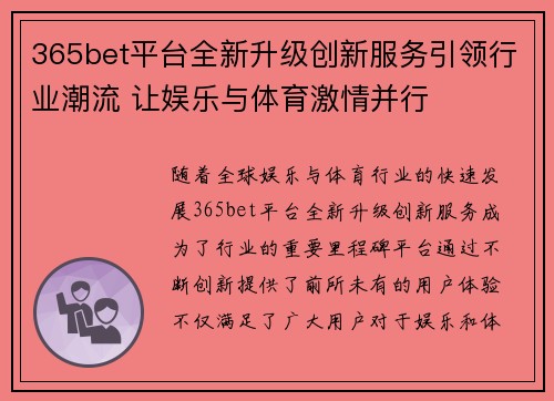 随着全球娱乐与体育行业的快速发展,365bet平台全新升级创新服务成为了行业的重要里程碑。平台通过不断创新,提供了前所未有的用户体验,不仅满足了广大用户对于娱乐和体育的需求,还为行业带来了全新的发展方向。本文将从四个方面深入阐述365bet平台如何引领行业潮流,让娱乐与体育激情并行,推动行业的全面升级。我们将分别探讨平台的创新服务、用户体验、技术升级与未来发展趋势,以及如何实现娱乐与体育的无缝结合,带来全新的行业格局。